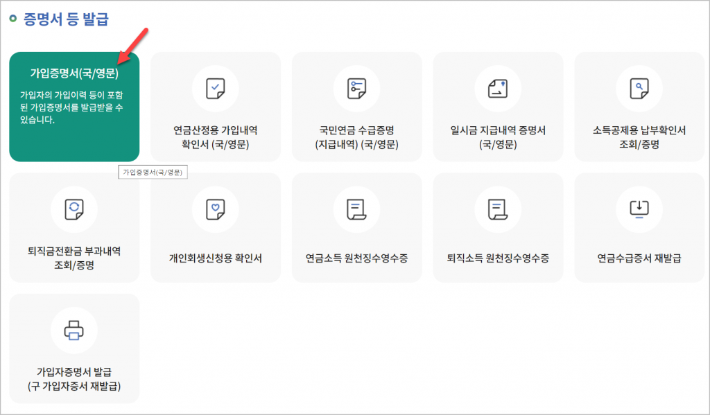 - 로그인을 진행한 후, 가입증명서 항목에서 국문/영문 중 원하는 버전을 선택합니다. 동의 절차 후 발급 버튼을 클릭하면 됩니다.
