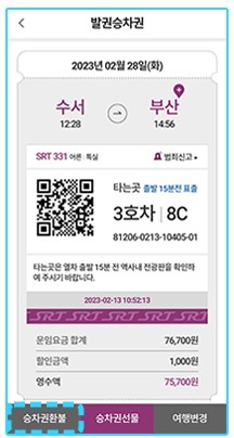 - SRT앱 및 홈페이지에서 예매한 승차권은 해당 플랫폼에서 직접 환불이 가능합니다.